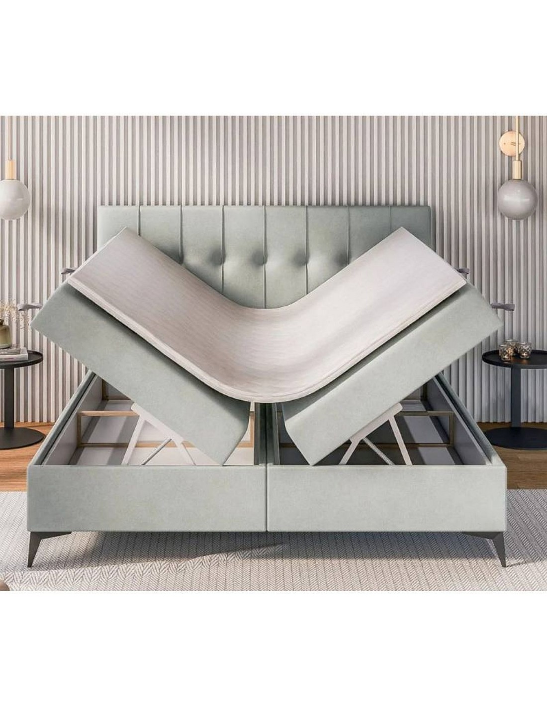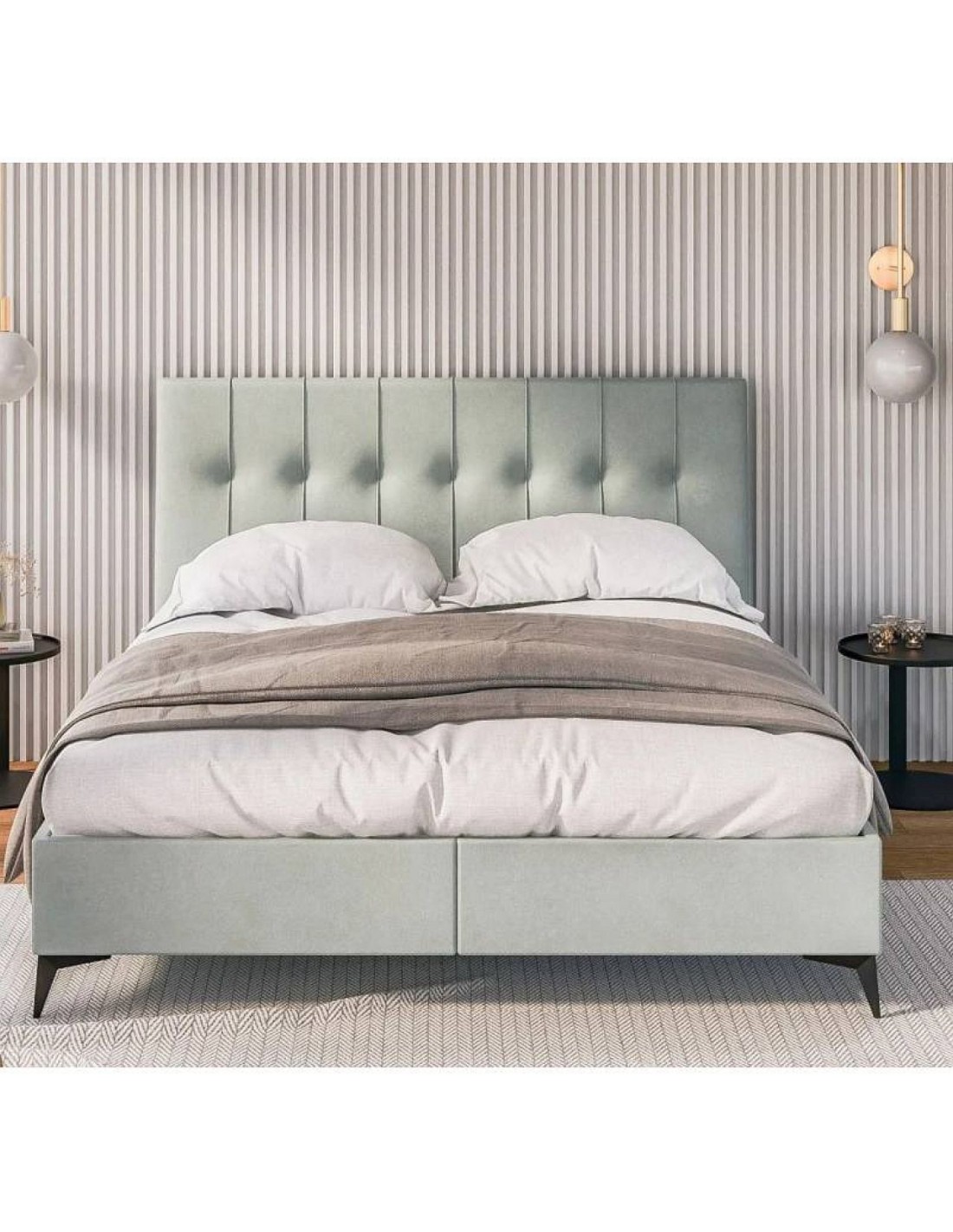 Кровать LINE с вертикально вышитым изголовьем и современными металлическими ножками станет стильным акцентом в любой спальне.
