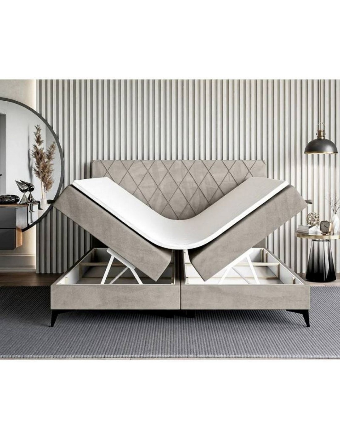 MILO — это стильная кровать с изголовьем, украшенным ромбовидным узором, которая добавит элегантности вашему интерьеру. Удобный матрас с наматрасником обеспечит комфортный отдых, а два ящика для белья позволят удобно хранить вещи. Прочное основание сочетается с различными стилями интерьера, а металлические ножки, доступные в матовом черном или хромированном исполнении, добавят современный штрих. Многослойная конструкция обеспечивает удобную высоту, что делает MILO отличным выбором для тех, кто ценит функциональность и эстетику.