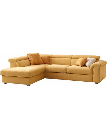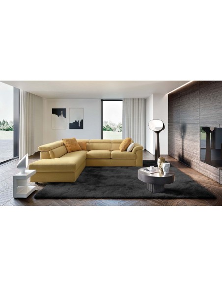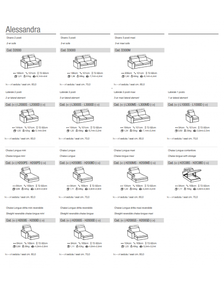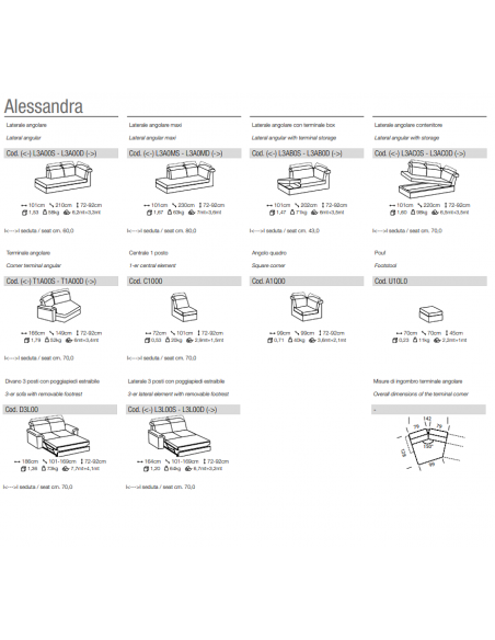 ALESSANDRA — современный угловой диван. Полностью съемная обивка, пригодная для стирки. Регулируемые подголовники. Может быть заказан со спальным местом и ящиком для белья. Дополнительно можно заказать пуф.