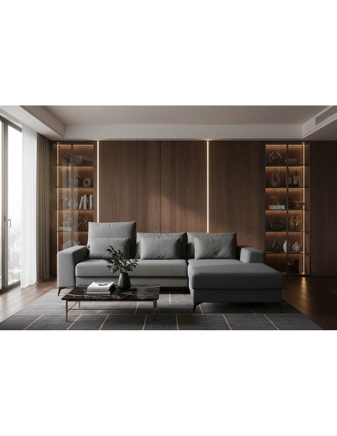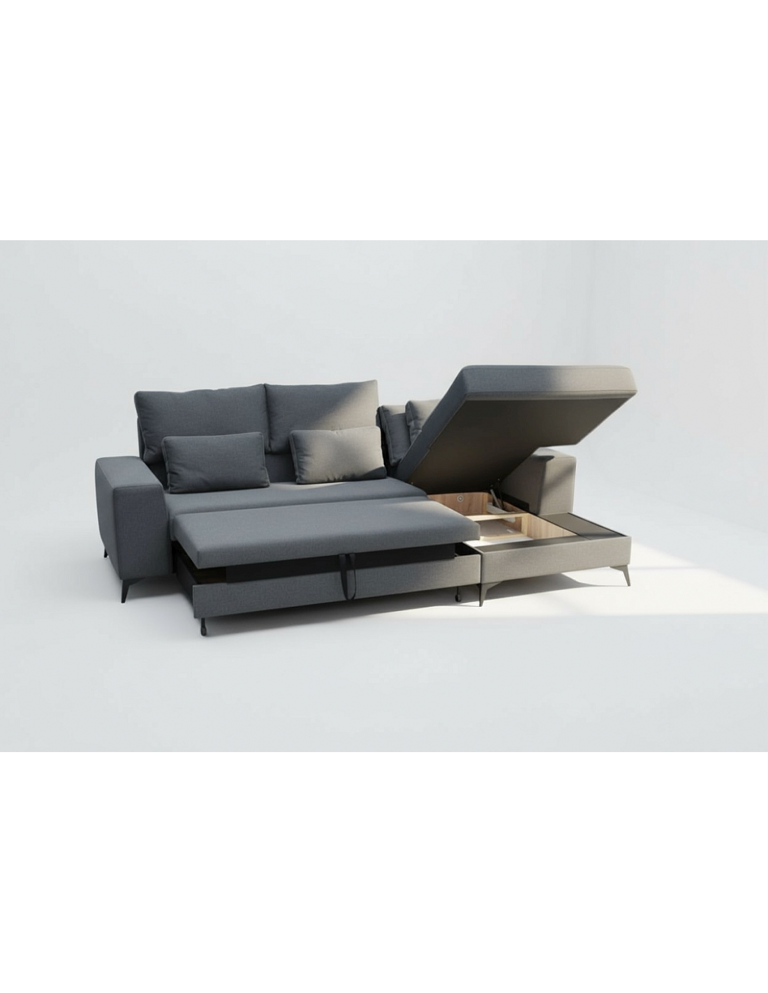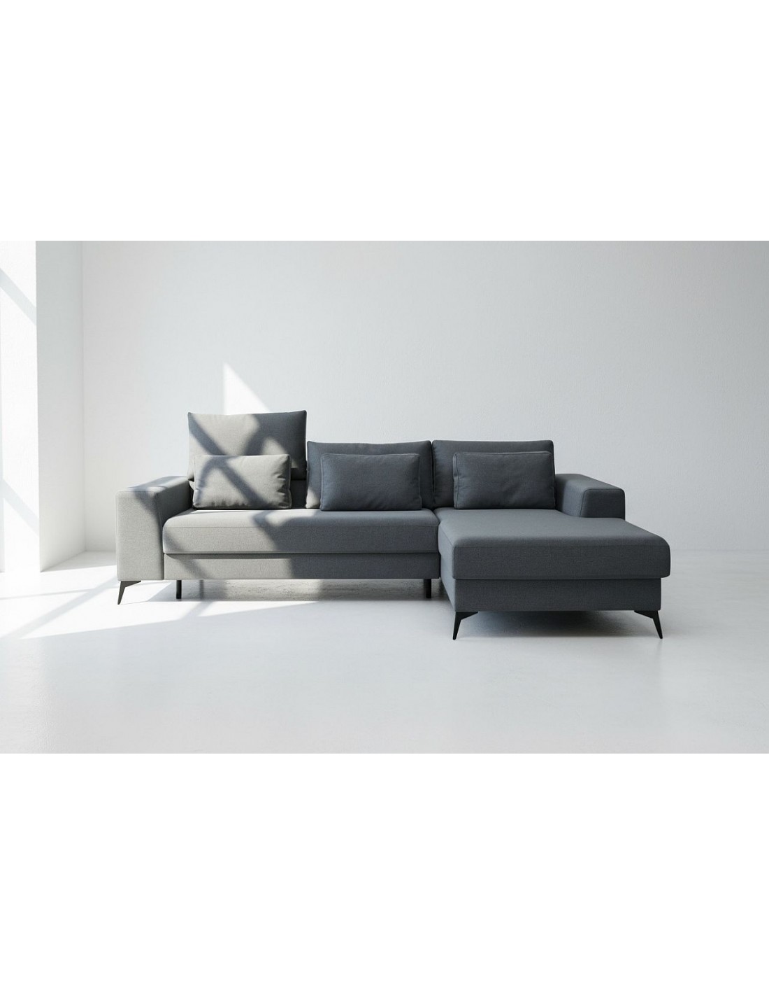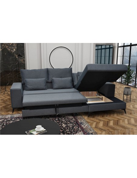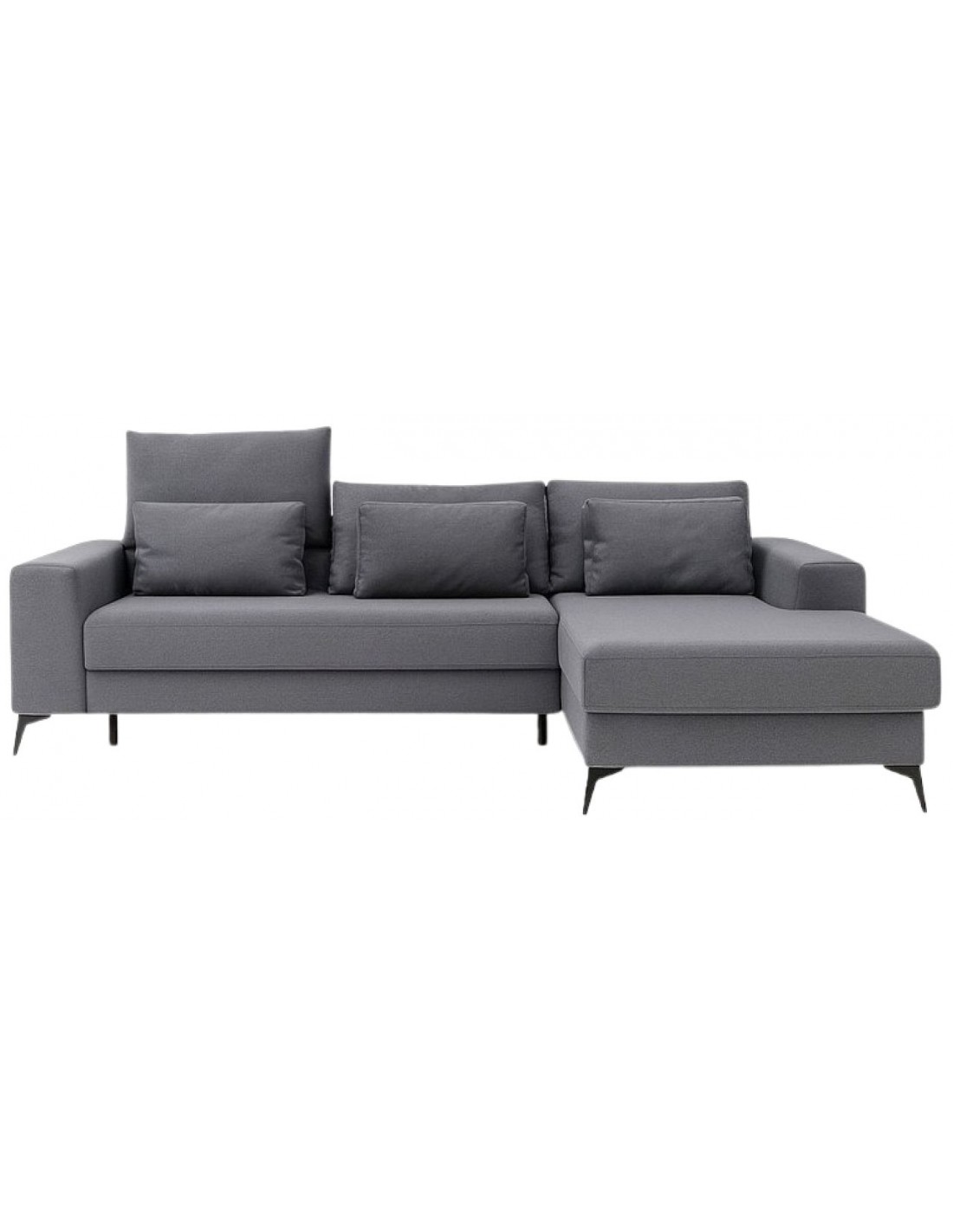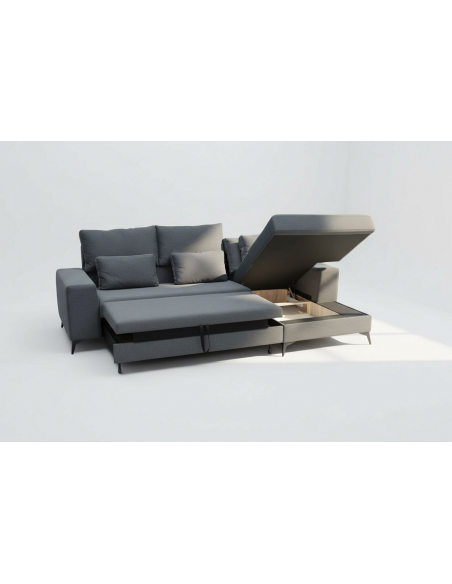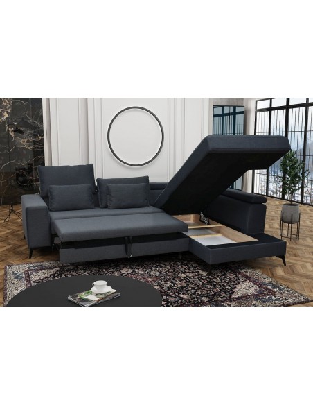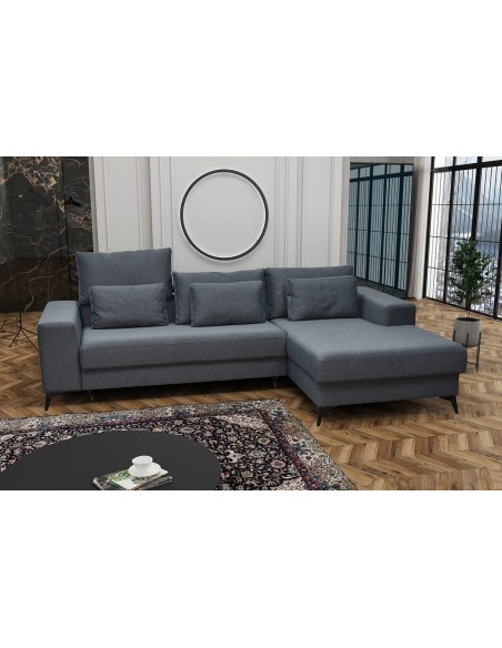 Удобный и стильный угловой диван современного дизайна DEDO. Угол дивана можно расположить как с правой, так и с левой стороны. Диван имеет регулируемые подголовники и 6 свободно перемещаемых подушек. Диван имеет бельевой ящик и выдвижную функцию. Спальная зона 150х220см.