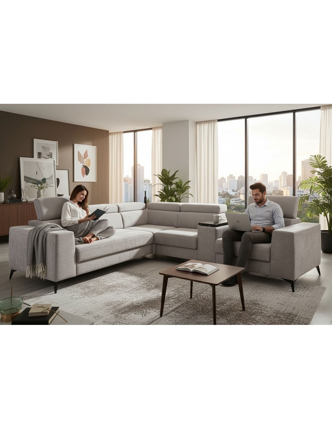 Угловой диван может располагаться справа или слева, его можно заказать с функцией электрического раскладывания.