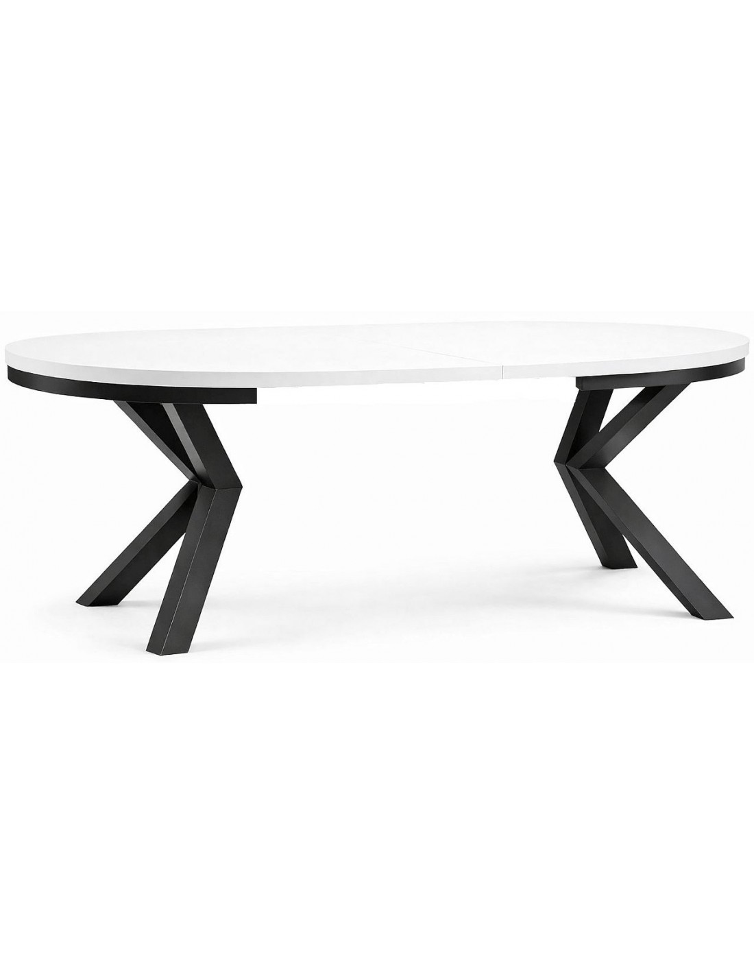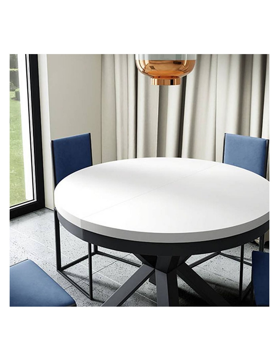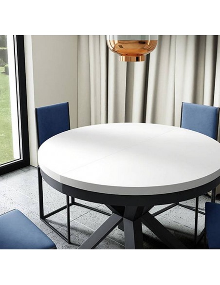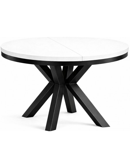 Круглый раздвижной стол VIGUS со столешницей из ламината и металлической окантовкой. Ножки изготовлены из черного металла с порошковым покрытием.