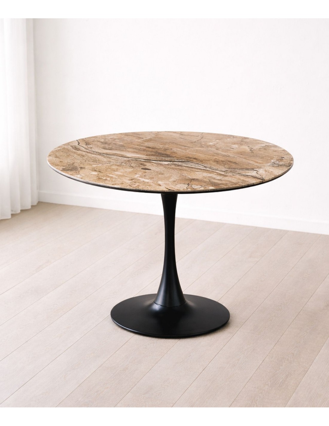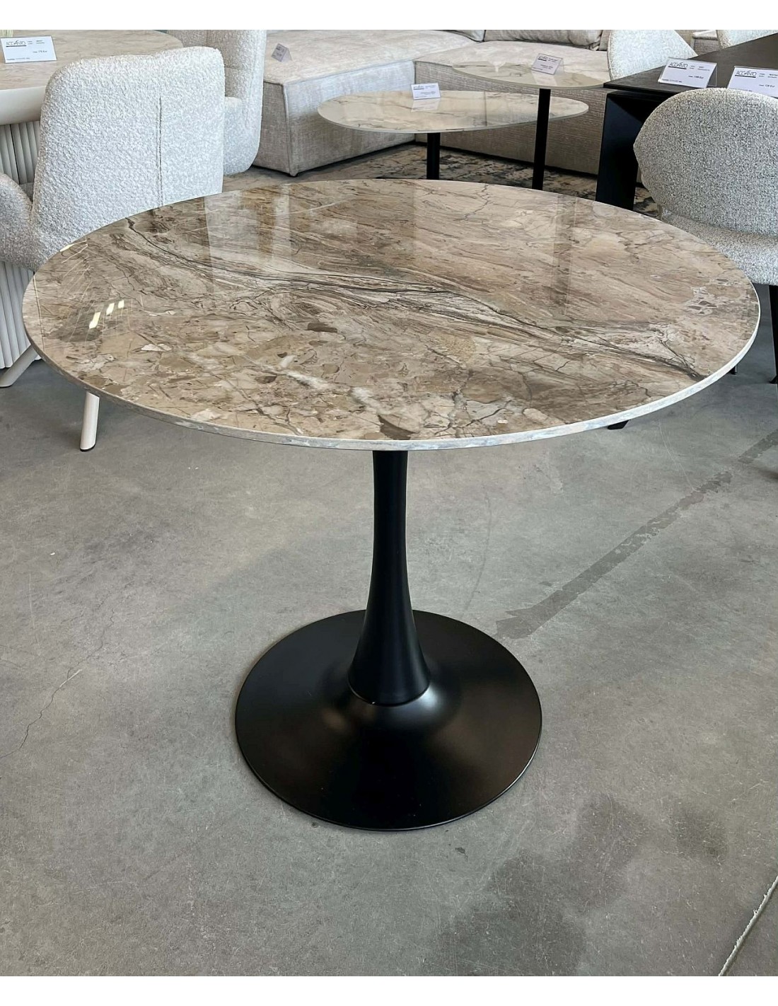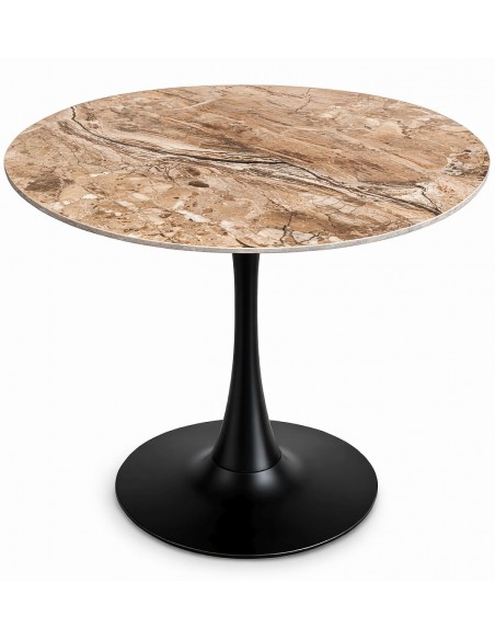 Стол керамический, глянцевая поверхность. Поверхность, имитирующая мрамор. Столешница устойчива к царапинам и нагреву. Металлическая ножка окрашена порошковой краской черного цвета.
