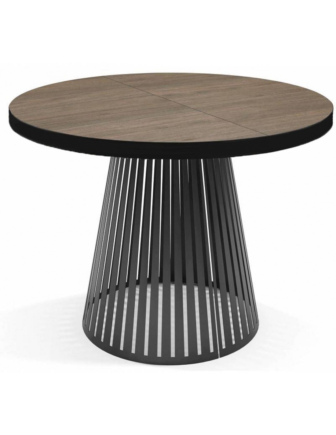 Обеденный стол NORE— это сочетание элегантности и современного дизайна, который прекрасно впишется как в домашний интерьер, так и в коммерческие помещения. Круглая столешница, удлиняющаяся на 76 см благодаря двум дополнительным вставкам по 38 см. Позволяет с комфортом разместить больше гостей. Ажурное конусообразное металлическое основание, покрытое порошковой краской, придает столу легкость и устойчивость. Столешница из шпона прочна и пригодна для ежедневного использования, ее толщина составляет 18 мм.