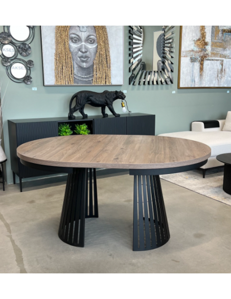 Обеденный стол NORE— это сочетание элегантности и современного дизайна, который прекрасно впишется как в домашний интерьер, так и в коммерческие помещения. Круглая столешница, удлиняющаяся на 76 см благодаря двум дополнительным вставкам по 38 см. Позволяет с комфортом разместить больше гостей. Ажурное конусообразное металлическое основание, покрытое порошковой краской, придает столу легкость и устойчивость. Столешница из шпона прочна и пригодна для ежедневного использования, ее толщина составляет 18 мм.