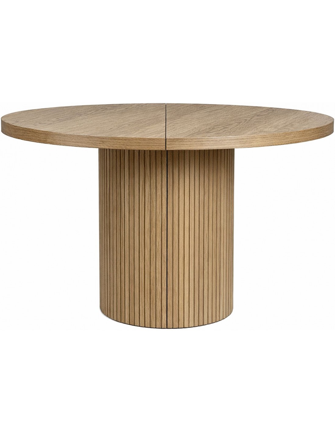 BUSSON — это современный и функциональный круглый обеденный стол из высококачественного дубового шпона, который подчеркивает естественную текстуру дерева и придает интерьеру теплоту и уникальность. Компактный стол легко раздвигается на +80 см, что делает его идеальным как для повседневного использования, так и для больших компаний или торжеств.