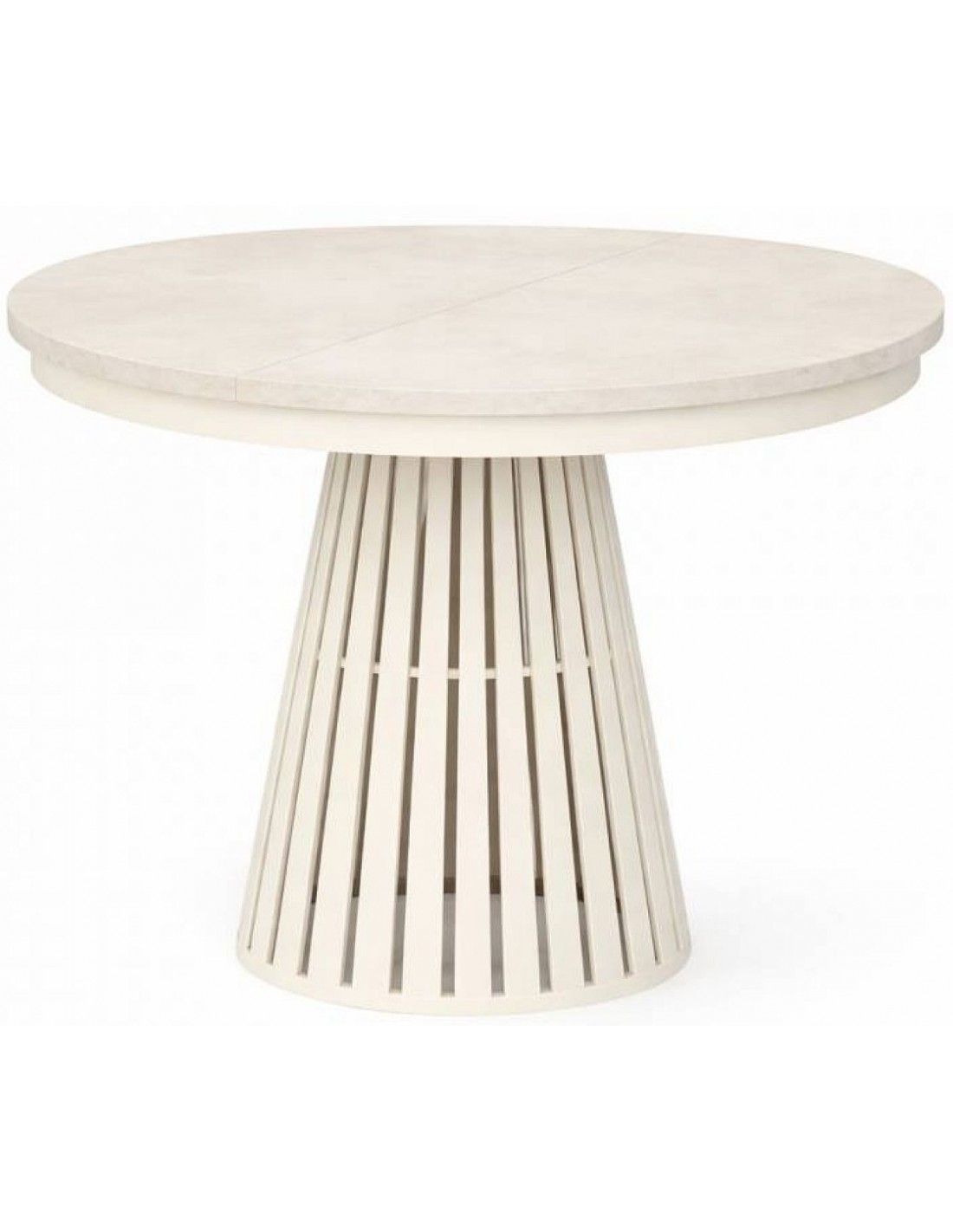 Раздвижной обеденный стол NORE с современным ажурным основанием и круглой ламинированной столешницей. Эстетика, функциональность и элегантность в одном.