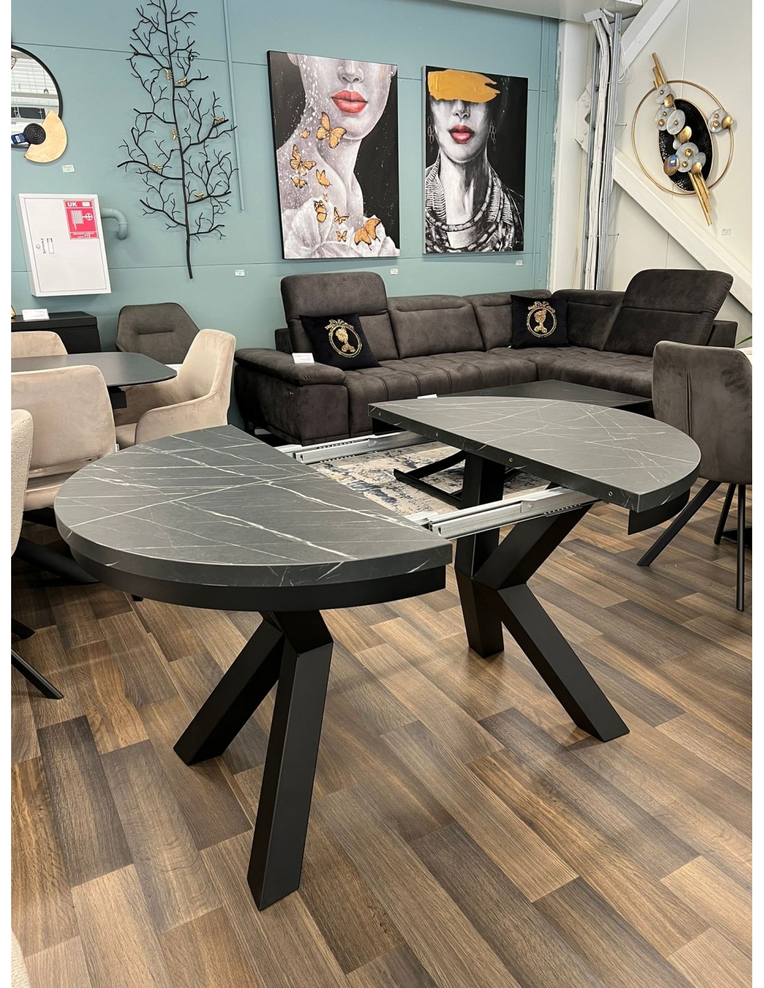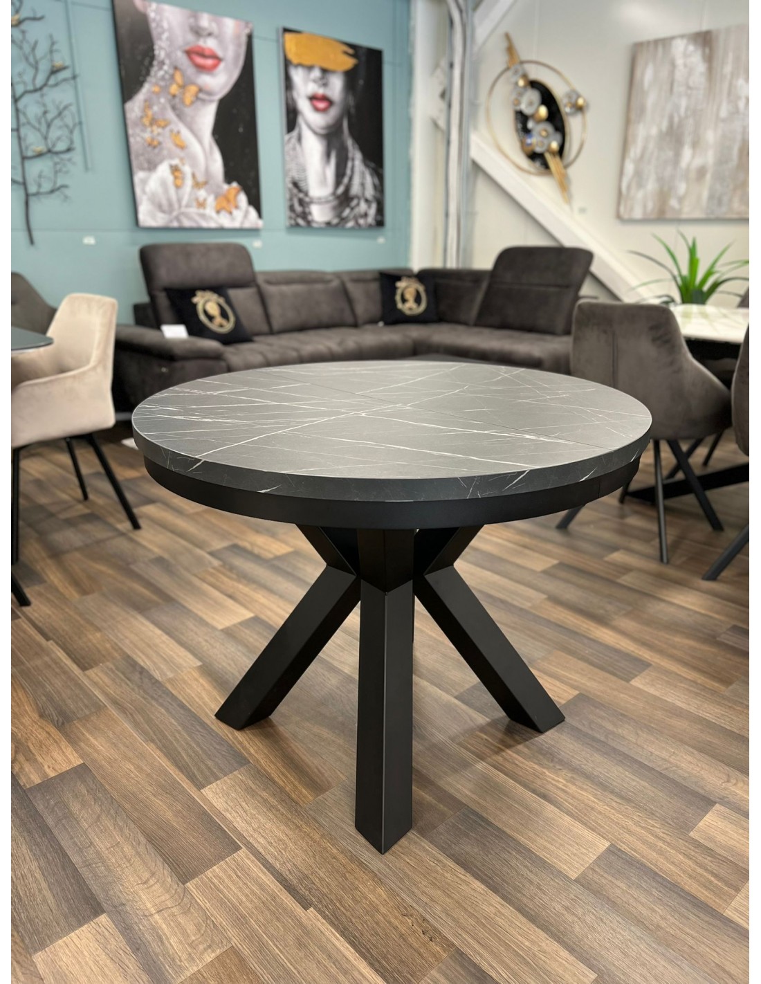 Круглый раздвижной стол VIGUS со столешницей из ламината и металлической окантовкой. Ножки изготовлены из черного металла с порошковым покрытием.