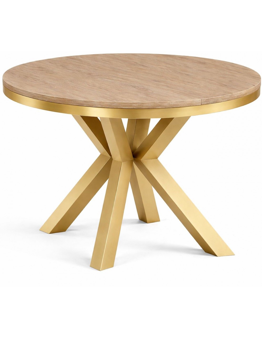 Круглый раздвижной стол VIGUS со столешницей из ламината и металлической окантовкой. Ножки изготовлены из металла золотистого цвета с порошковым покрытием.