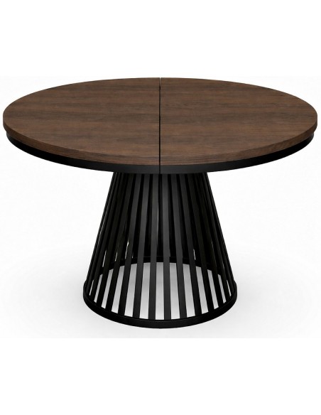 Обеденный стол NORE— это сочетание элегантности и современного дизайна, который прекрасно впишется как в домашний интерьер, так и в коммерческие помещения. Круглая столешница, удлиняющаяся на 76 см благодаря двум дополнительным вставкам по 38 см. Позволяет с комфортом разместить больше гостей. Ажурное конусообразное металлическое основание, покрытое порошковой краской, придает столу легкость и устойчивость. Столешница из шпона прочна и пригодна для ежедневного использования, ее толщина составляет 18 мм.