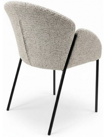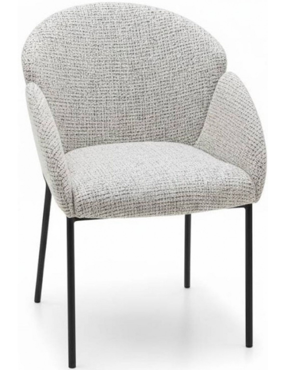 Сиденье обеденного стула MONNA обито тканью букле светло-серого цвета, ножки — чёрные с металлическим оттенком.