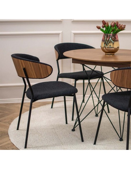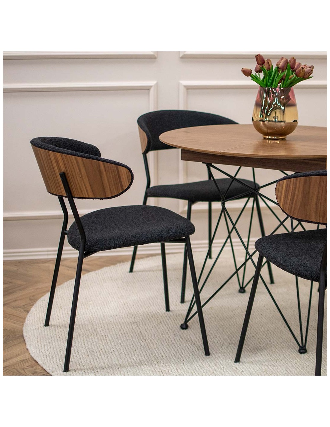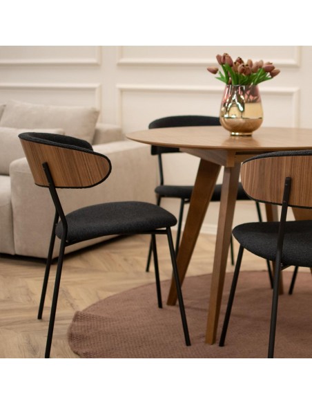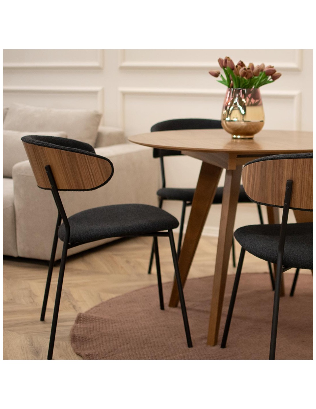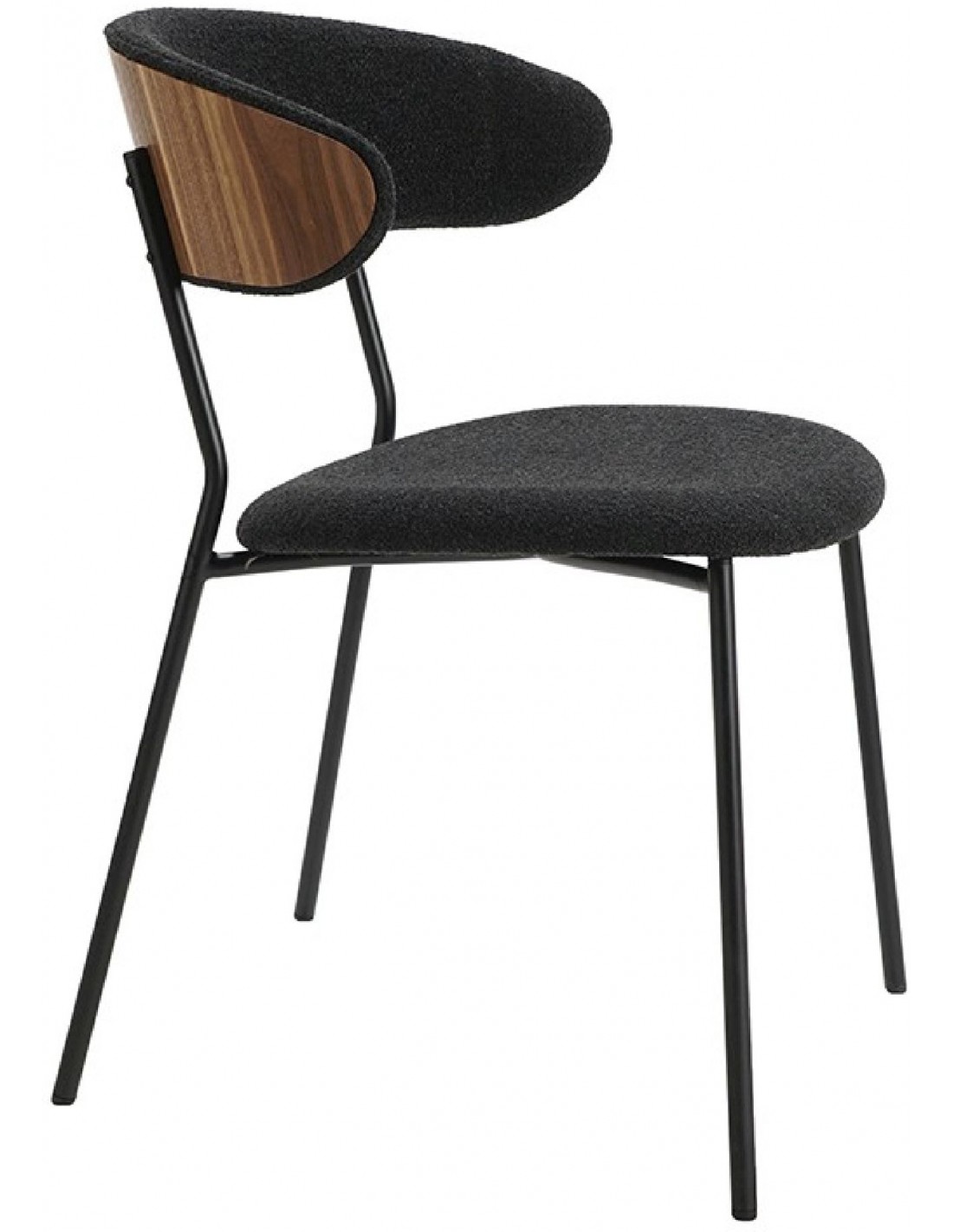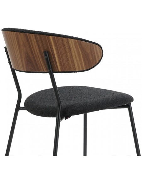 Сиденье и спинка стула имеют закругленные края. Спинка выдвигается и поворачивается в сторону. Металлическая конструкция, удерживающая спинку, имеет стильную изогнутую форму.  Внешнюю часть спинки можно выбрать с отделкой шпоном цвета дуба или ореха.