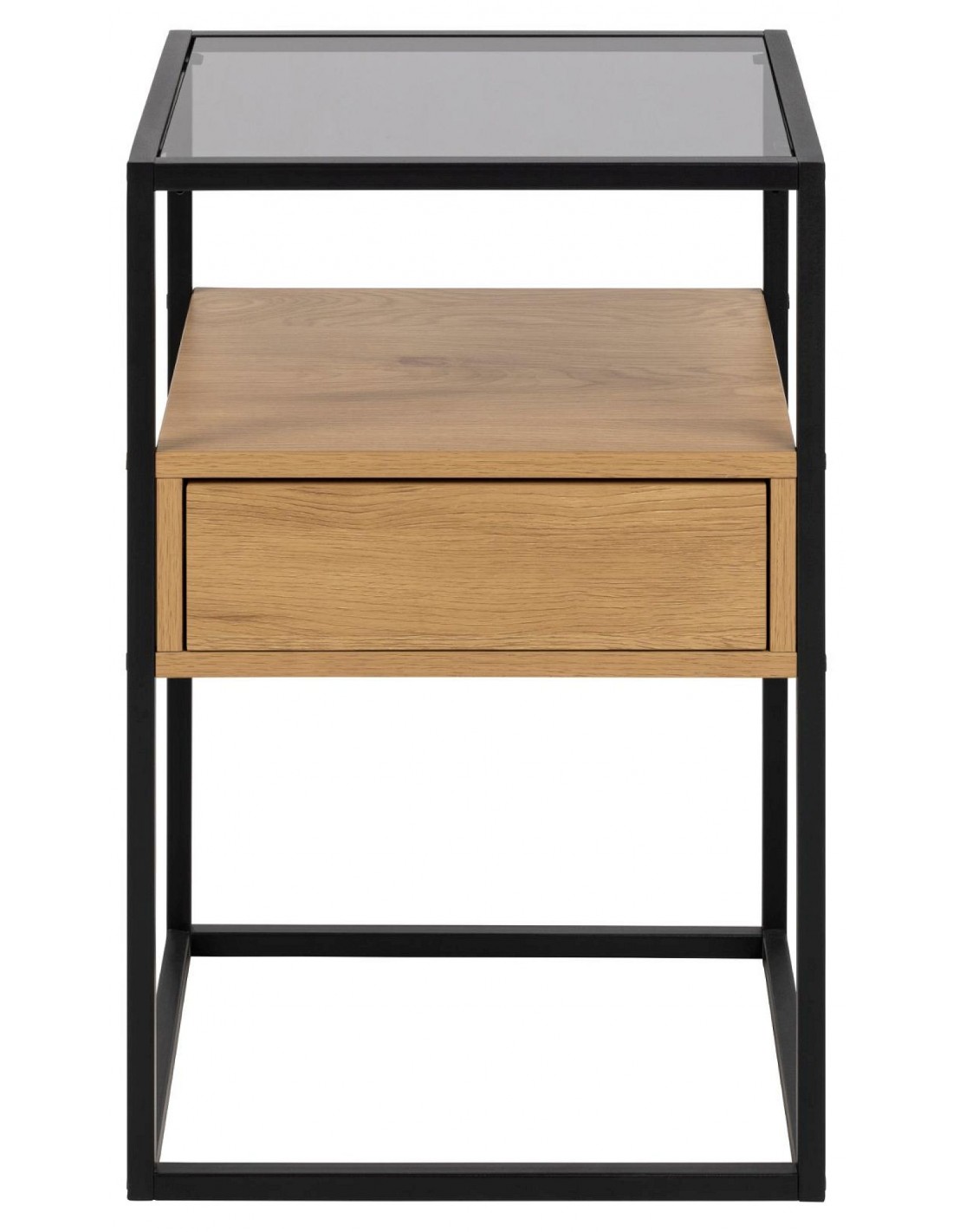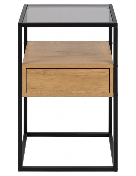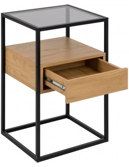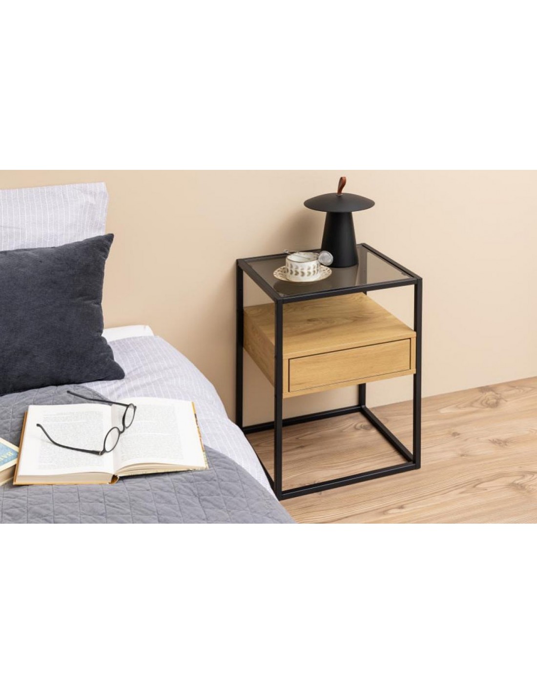 Прикроватная тумбочка с дымчатым стеклом, чёрным металлическим каркасом и отделкой под дуб — современный и практичный предмет мебели для вашей спальни.