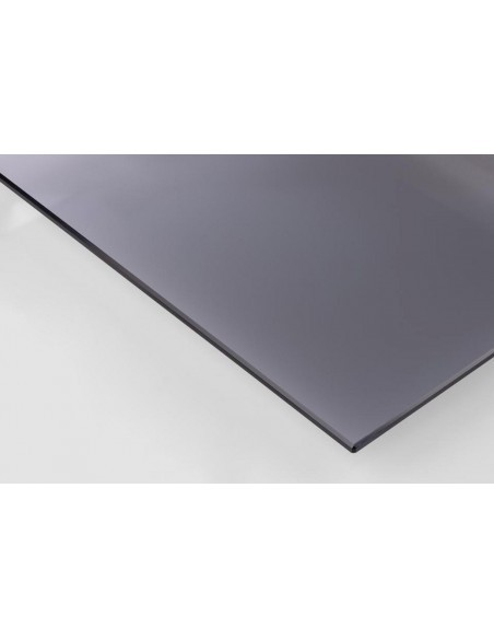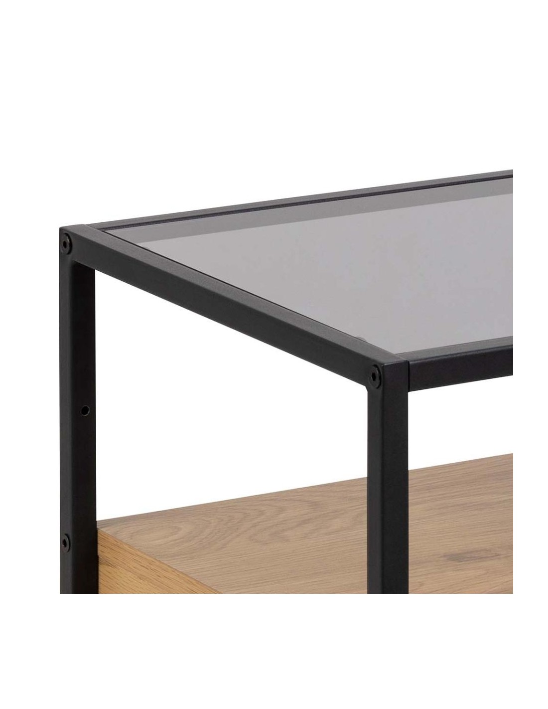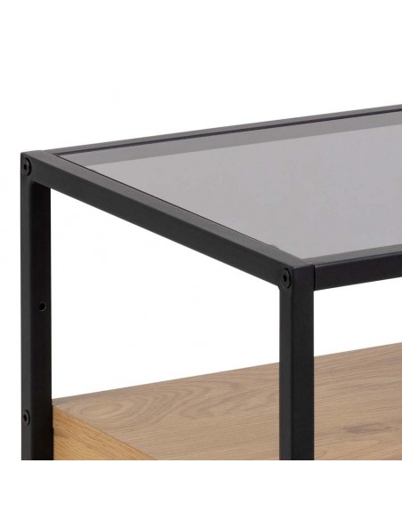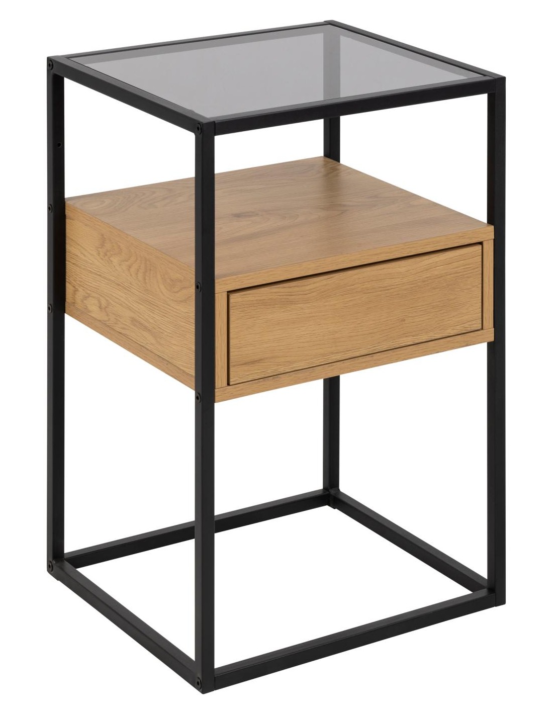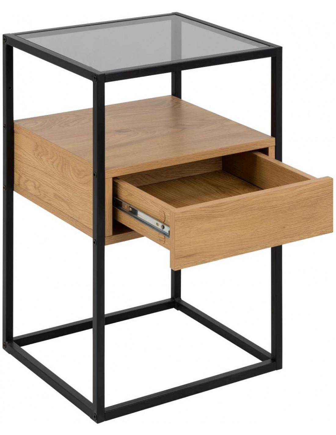 Прикроватная тумбочка с дымчатым стеклом, чёрным металлическим каркасом и отделкой под дуб — современный и практичный предмет мебели для вашей спальни.