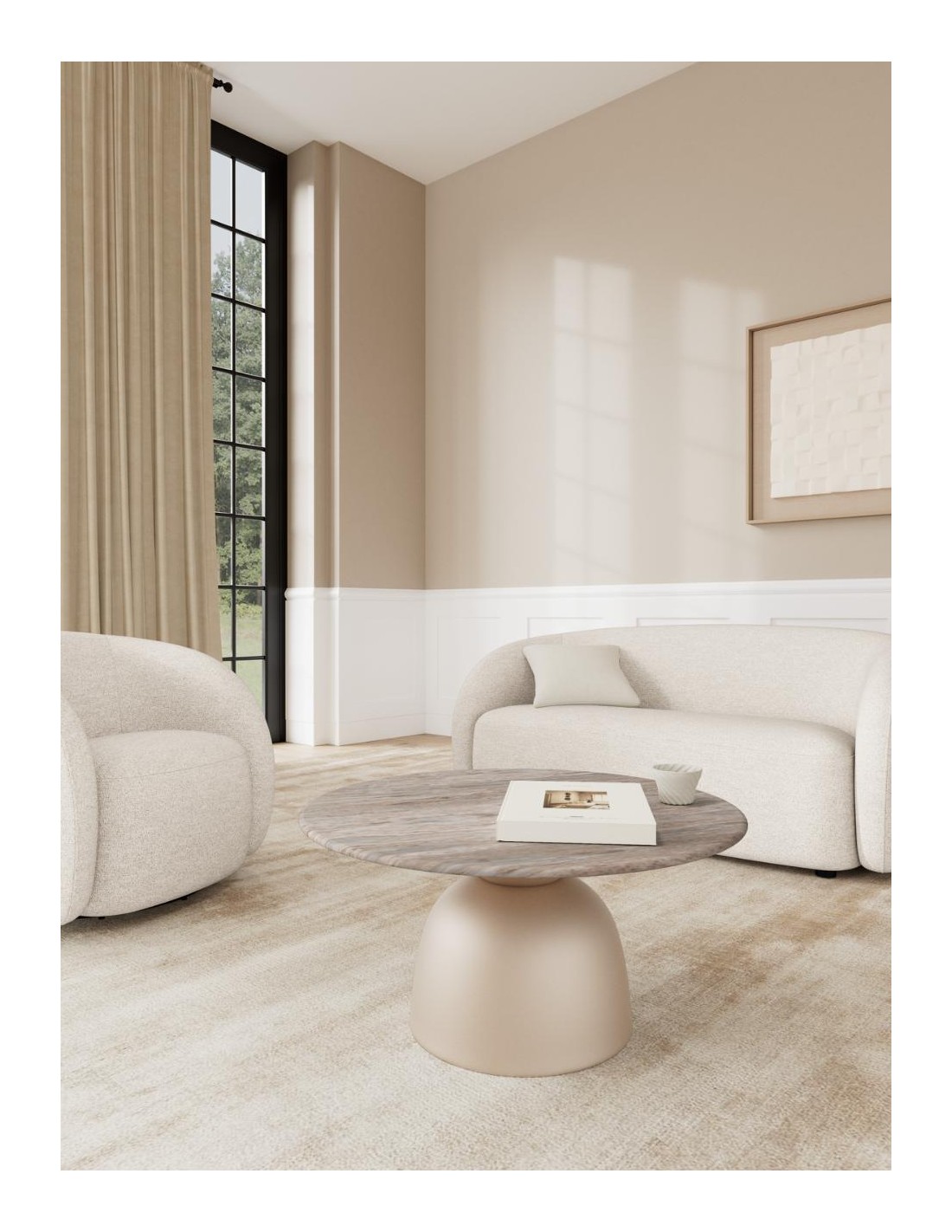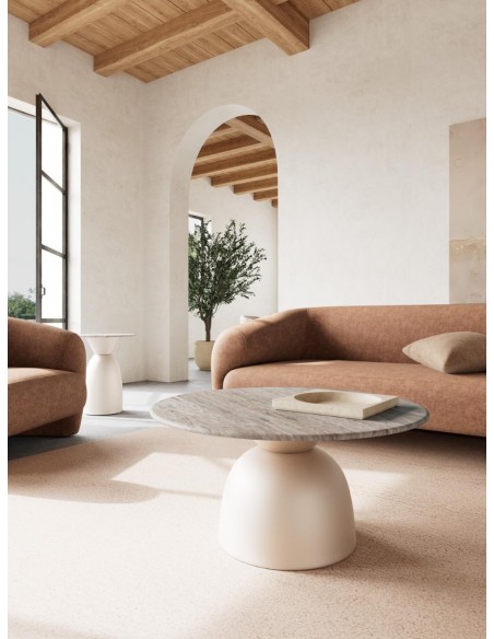 Круглый журнальный столик с серо-коричневой мраморной столешницей и металлическим основанием цвета кашемира добавит элегантности вашему интерьеру.