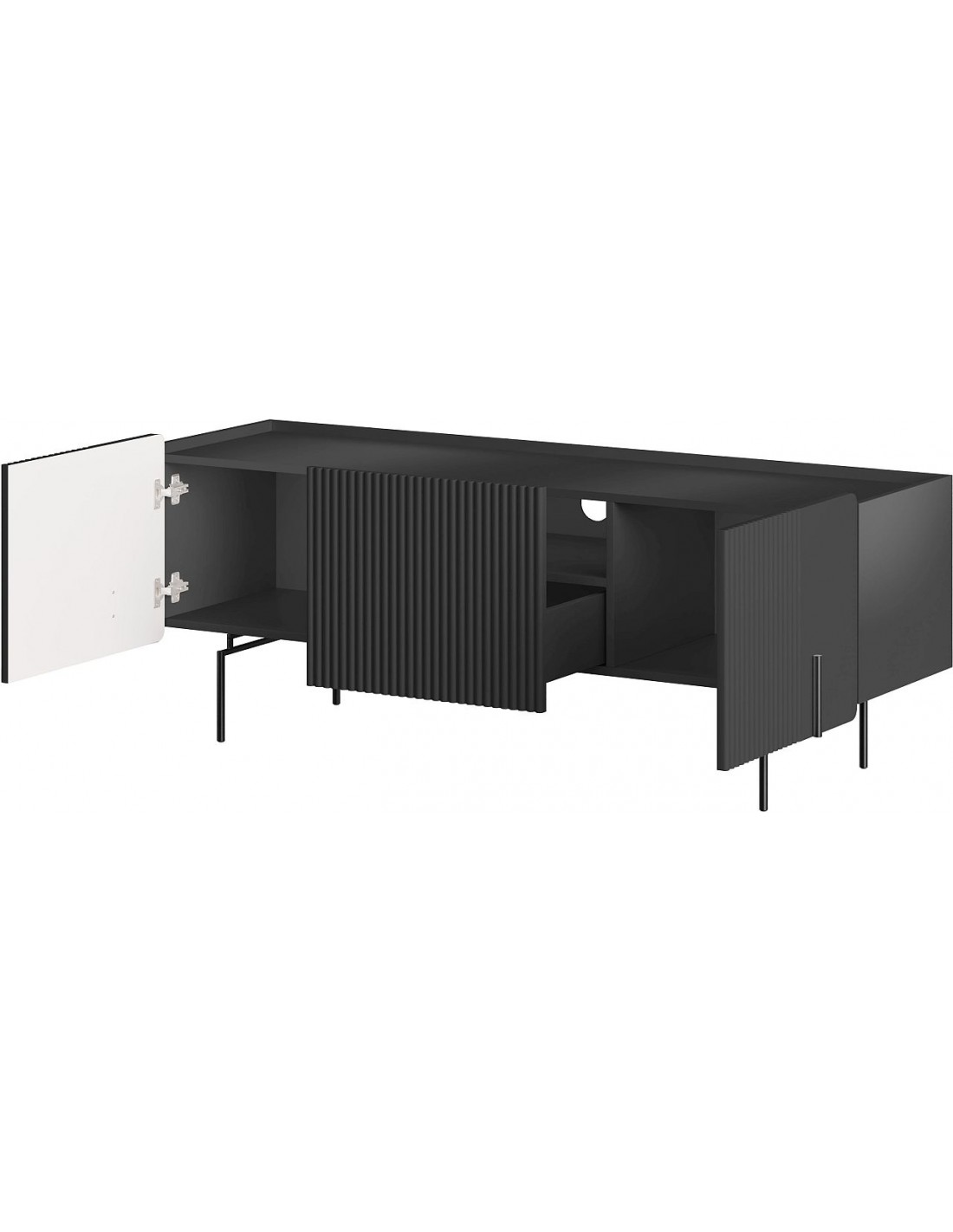 Тумба имеет две дверцы, один вместительный ящик и открытую нишу сзади для удобного хранения мультимедийного оборудования. Интегрированная система управления кабелями внутри обеспечивает порядок и удобство. Система плавного закрывания и открывания Push to Open обеспечивают бесшумное и надёжное использование.