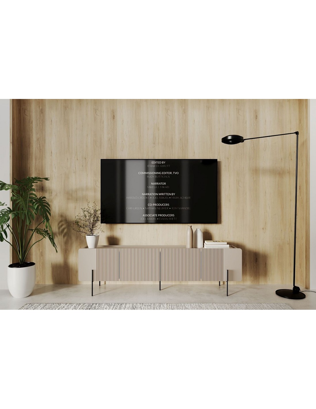 Тумба имеет две двери, два вместительных ящика и открытую нишу сзади для удобного хранения мультимедийного оборудования. Интегрированная система управления кабелями внутри обеспечивает порядок и удобство. Система плавного закрывания и открывание от нажатия обеспечивают бесшумное и надёжное использование. Тумба крепится к стене.