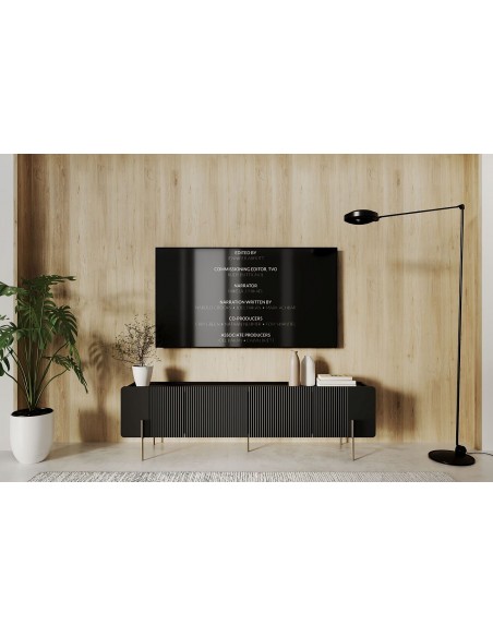 Izgatavots pēc Accanto grupas pasūtījuma (MB)Компактная тумба под телевизор MALMI с ребристым фасадом, металлическими ножками и удобным выдвижным ящиком — современный и функциональный выбор для гостиной.