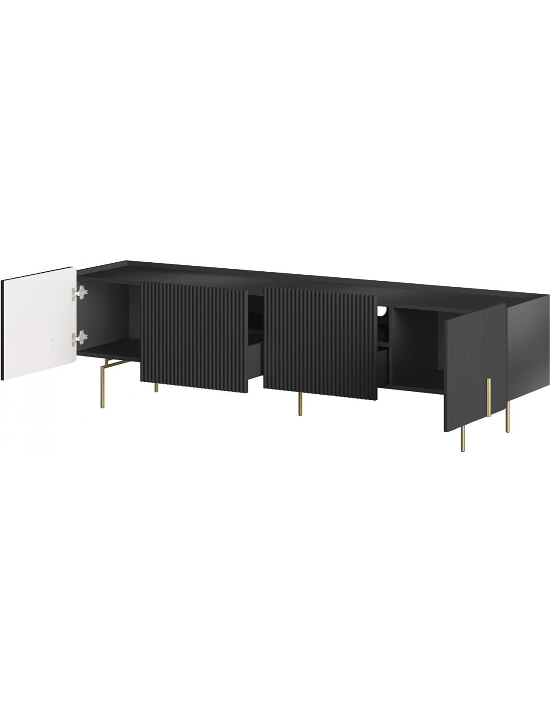 Тумба имеет две двери, два вместительных ящика и открытую нишу сзади для удобного хранения мультимедийного оборудования. Интегрированная система управления кабелями внутри обеспечивает порядок и удобство. Система плавного закрывания и открывание от нажатия обеспечивают бесшумное и надёжное использование. Тумба крепится к стене.
