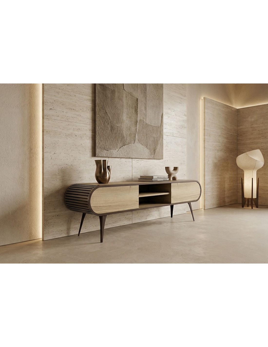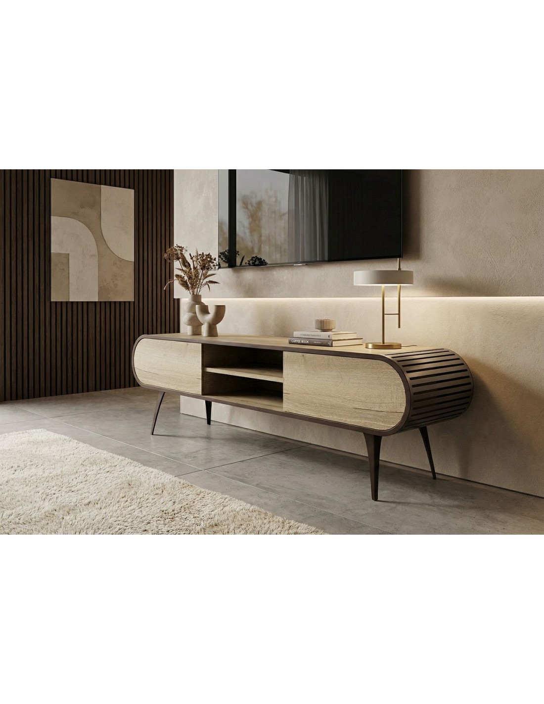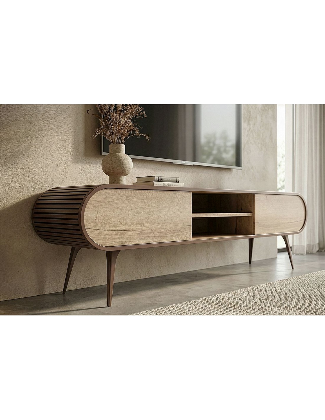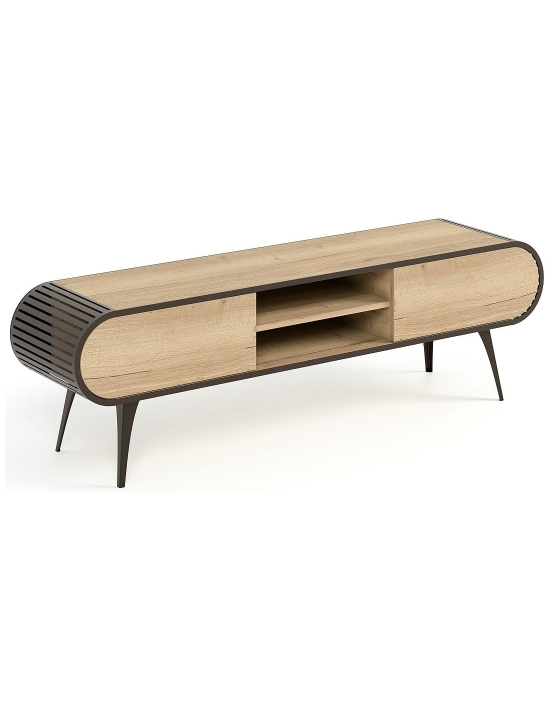 Izgatavots pēc Accanto grupas pasūtījuma (EG)Просторная тумба под телевизор ORIST с открытыми и закрытыми полками, корпусом из шпона и металлическими ножками — для аккуратной и современной гостиной.