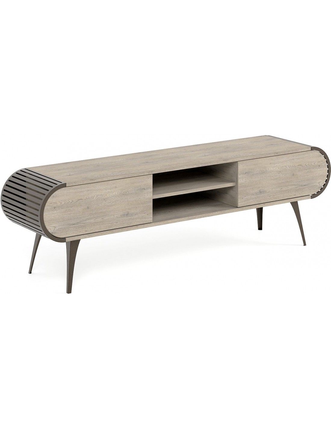 Izgatavots pēc Accanto grupas pasūtījuma (EG)Просторная тумба под телевизор ORIST с открытыми и закрытыми полками, корпусом из шпона и металлическими ножками — для аккуратной и современной гостиной.