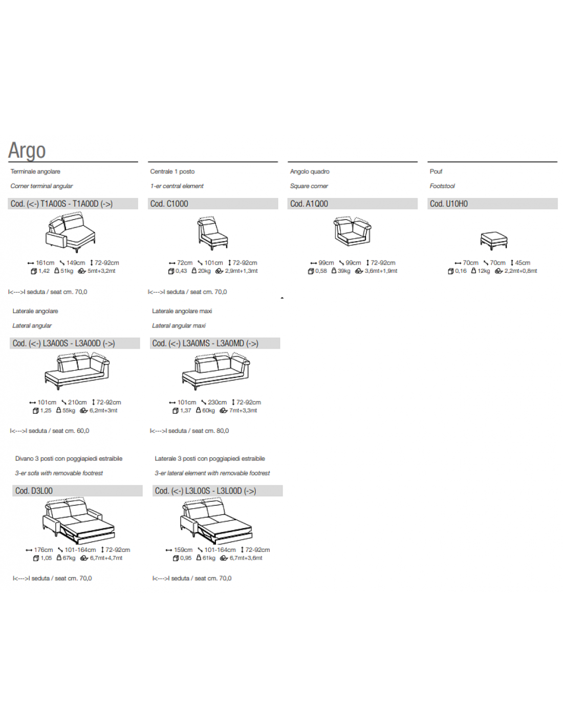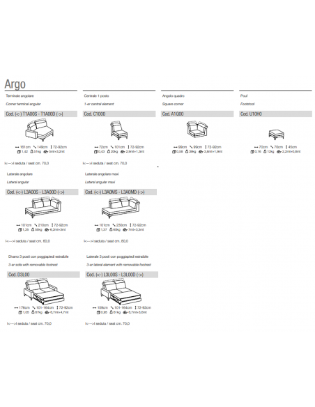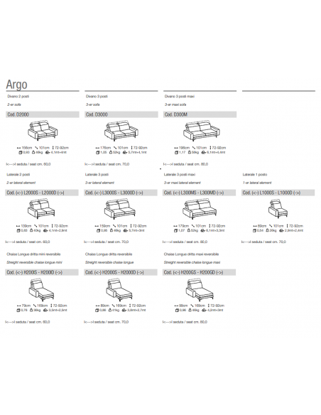 ARGO — современный угловой диван. Полностью съемная обивка, пригодная для стирки. Регулируемые подголовники. Может быть заказан со спальным местом, без ящика для белья. Дополнительно можно заказать пуф.