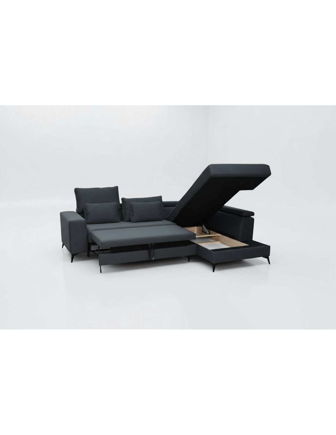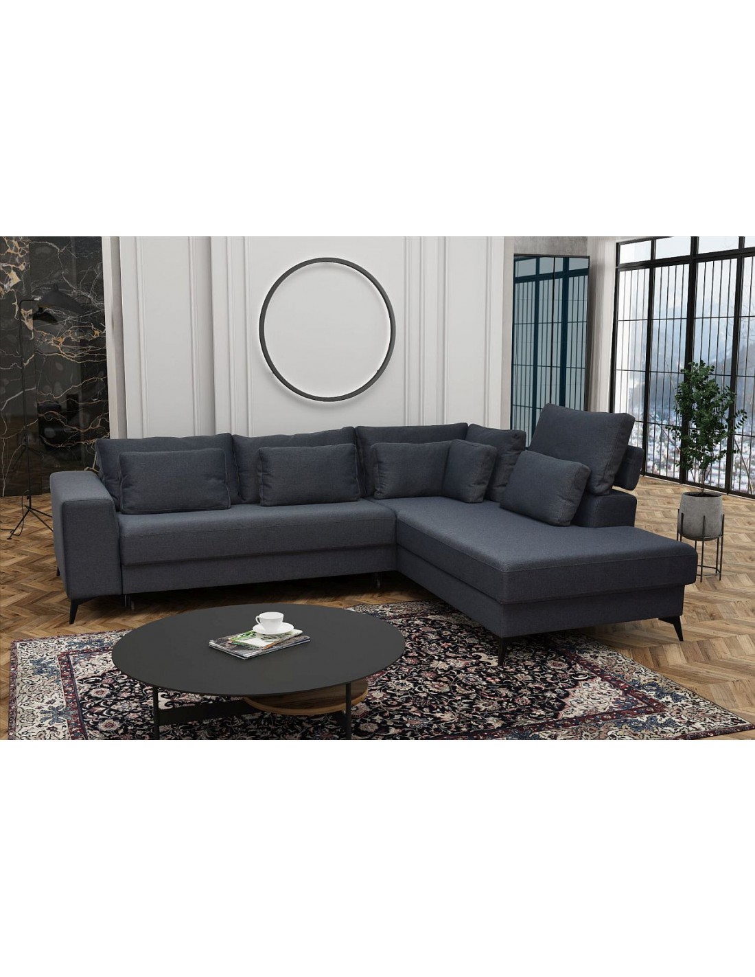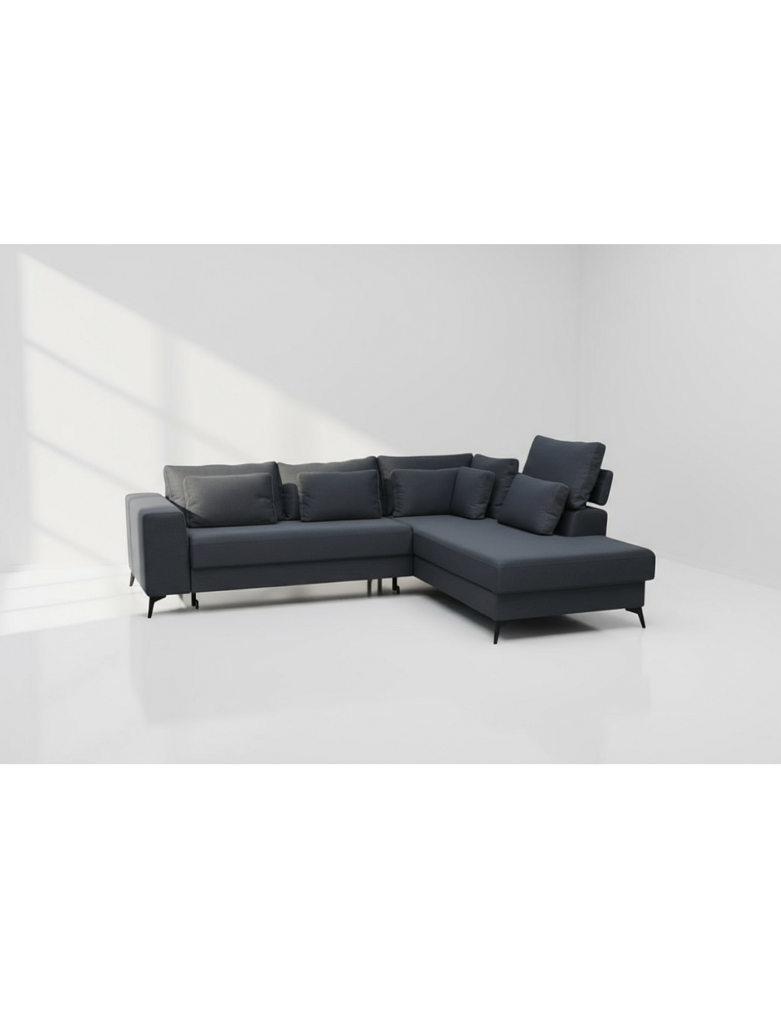 Удобный и стильный угловой диван современного дизайна DEDO. Угол дивана можно расположить как с правой, так и с левой стороны. Диван имеет регулируемые подголовники и 6 свободно перемещаемых подушек. Диван имеет бельевой ящик и выдвижную функцию. Спальная зона 150х220см.