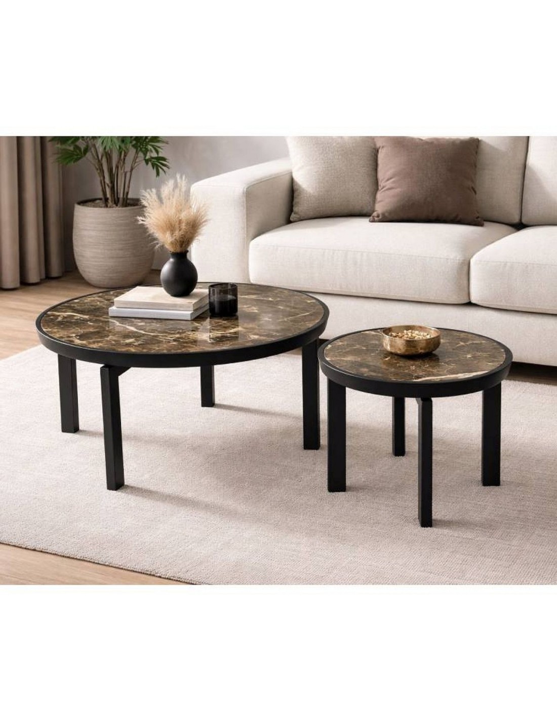 Круглый журнальный столик с темно-коричневой керамической столешницей с мелким пятнистым рисунком и черными ножками, создающий современный и солидный акцент в интерьере.